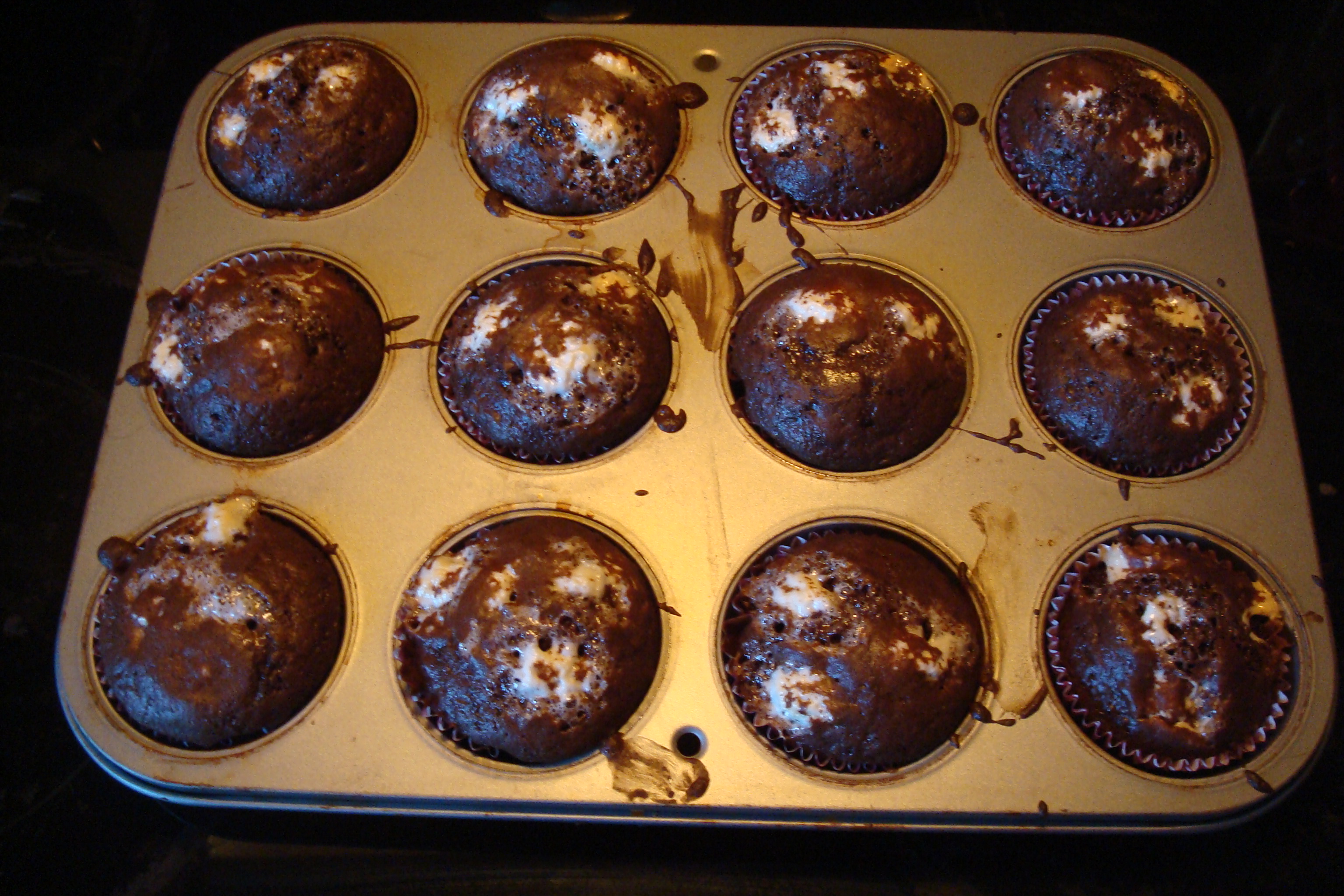 Mix the cake batter according to directions, adding the chocolate chips. Fill each cup about 1/3 of the way with the cake batter. Drop three mini marshmallows in each cup. Finish filling the cups with the remaining batter to about 2/3 full. Bake in the oven according to the directions for cupcakes on your Devil’s Food Cake mix.