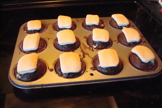 When you remove them from the oven, flip the oven to broil. Place your large marshmallows on top of each cupcake, then pop them back into the oven. Broil until they puff up and are very lightly browned, watching closely, since they will burn very quickly. Remove, cool, and enjoy!