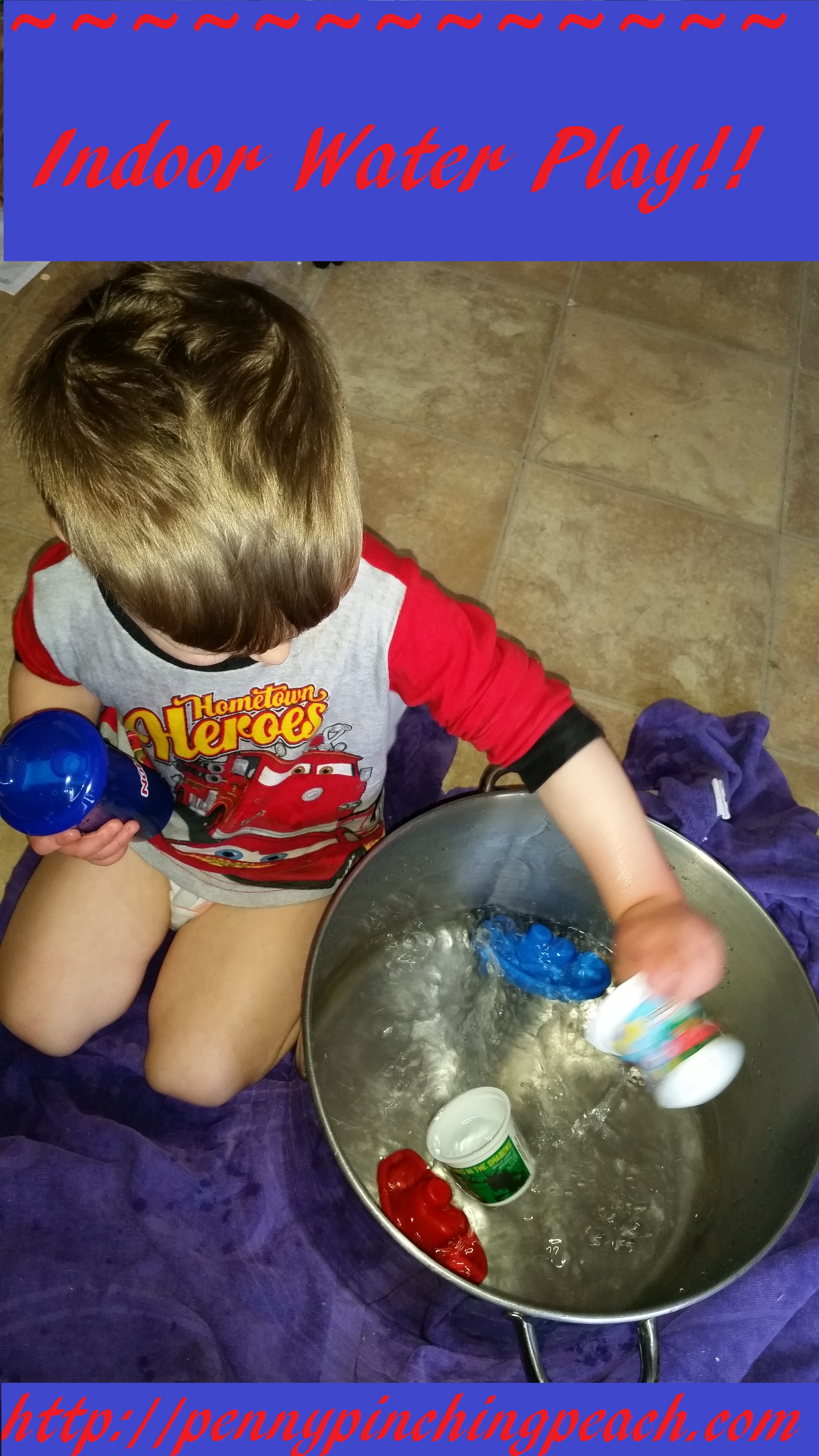 I get out my humongous pot and fill it about a third of the way with water. I’ll set it on a beach towel on the kitchen floor, then throw in some cups, toy boats, funnels or other small items that will be fun to play with in the water. They can easily stay at this simple activity for the better part of an hour, especially if I switch out the toys every 15-20 minutes or so.