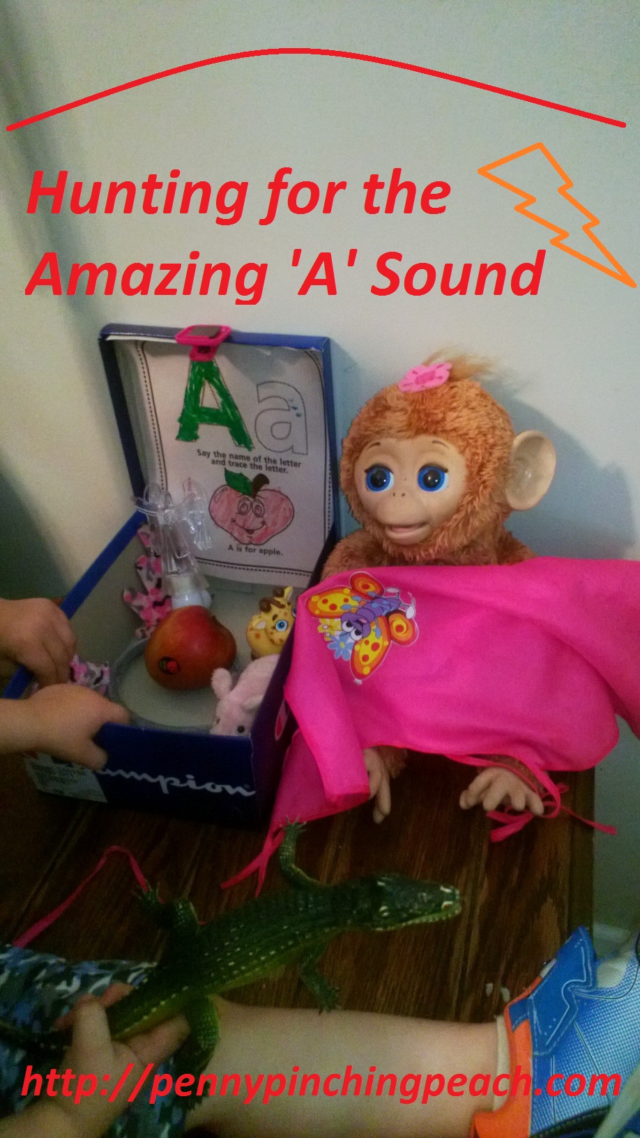 In the above picture, she found: ape, apple, apron, antlers, animal, alligator, angel.