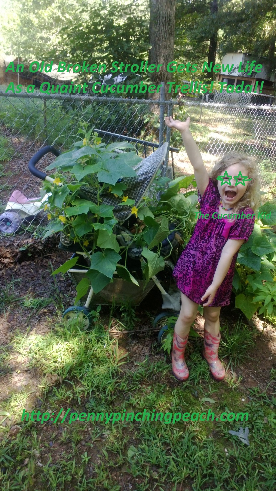 It works great! We had this ancient stroller left outside on our property by a former resident and beyond safe use for it’s original purpose. We’d never bothered to haul it off, so I rolled it’s wobbling wheels on over to the end of my garden and started encouraging my cucumbers to climb. The photos illustrate the interesting results. My daughter loves it. She says our cucumbers are babies with their own baby carriage, and is eager to show off her baby cucumbers to anyone who may happen to be around. 🙂